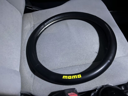 ハンドルカバーを付けたことによって、ハンドルの下に黄色いMOMOのロゴがあるので上下がわかりやすくなりました。