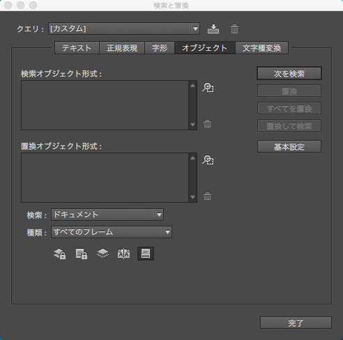 インデザインの検索・置換では「オブジェクトの検索」もできます。