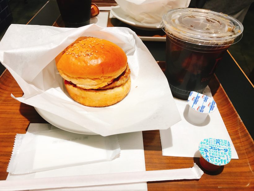 朝バーガーとアイスコーヒーでーす。
