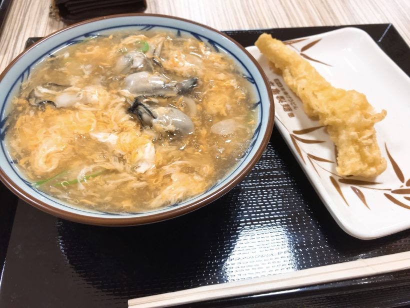 今回は牡蠣づくしのあんかけうどんにしました!イカ天も外せないぜ。