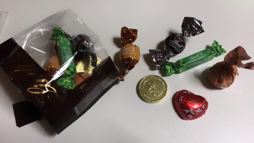 左側の茶色は、外側がミルクチョコレートで、中にキャラメリゼされたクルミなどが入っていました。