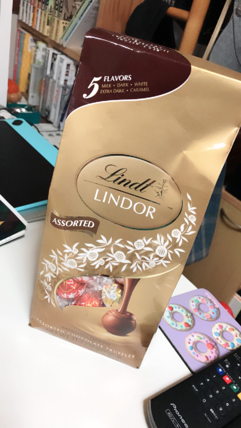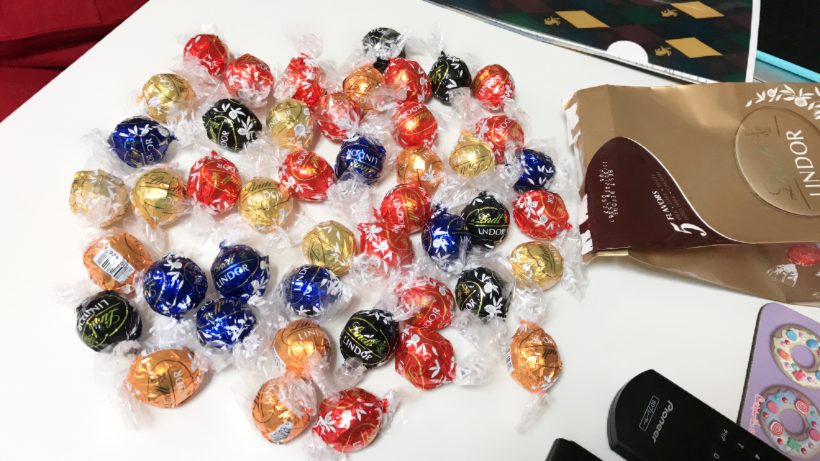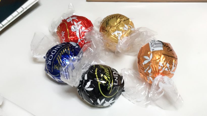 5種類入っていて、赤がミルク、青がダーク、黄がホワイト、黒がエクストラダーク、橙がキャラメルです。