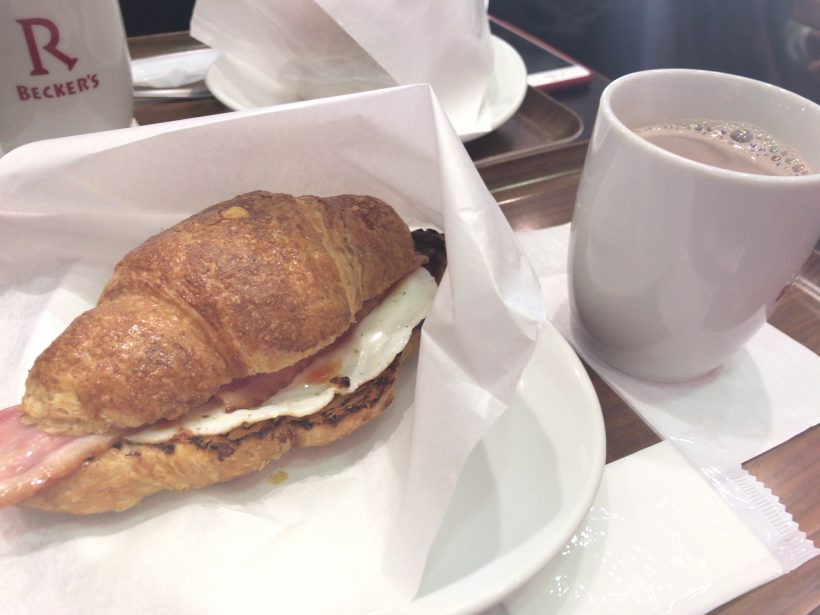 朝食はクロワッサンサンドとホットショコラにしたんですけど、挟んである目玉焼きが半熟すぎて、黄身が割と大惨事www