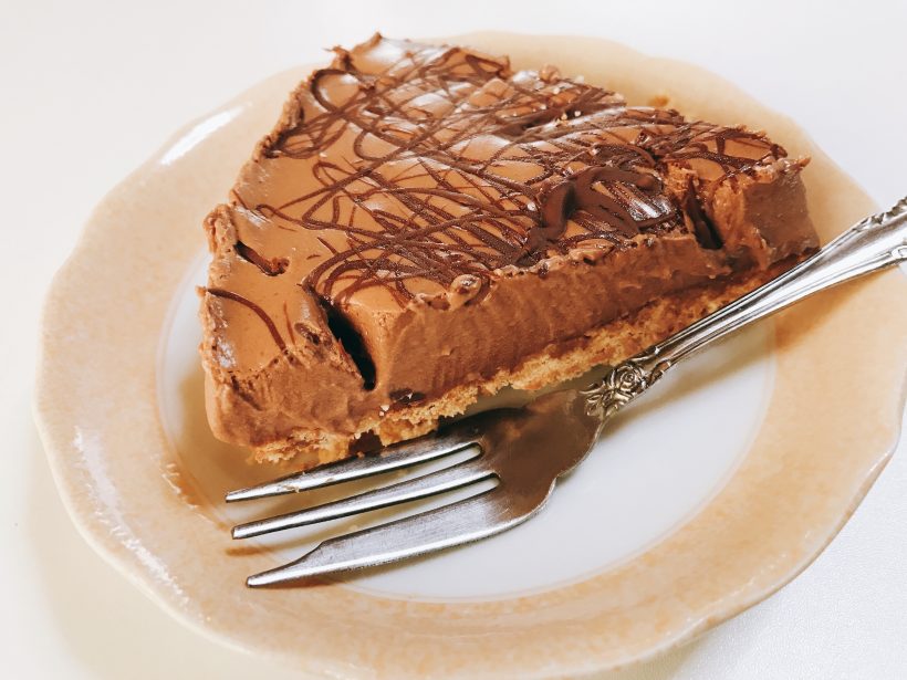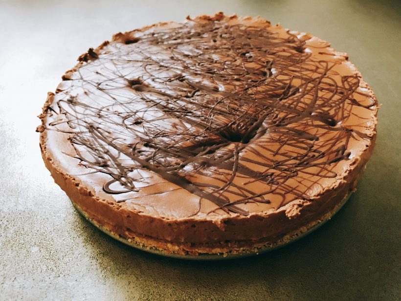 ビスケット砕いて、溶かしバター入れて混ぜて敷き詰めた土台の上に、生クリームとチョコ溶かして、8分立てぐらいにした生クリームを入れて混ぜて、土台の上に流し込んで冷やすだけの簡単なお仕事。