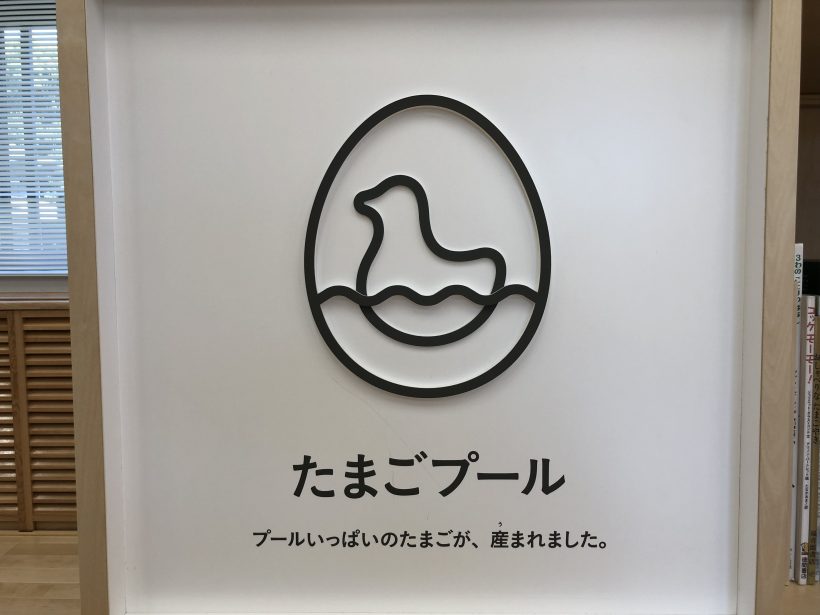 実際に時間になって行ってみると、木のフローリングの部屋に動物の本がたくさん置かれていて、真ん中には「たまごプール」があります。