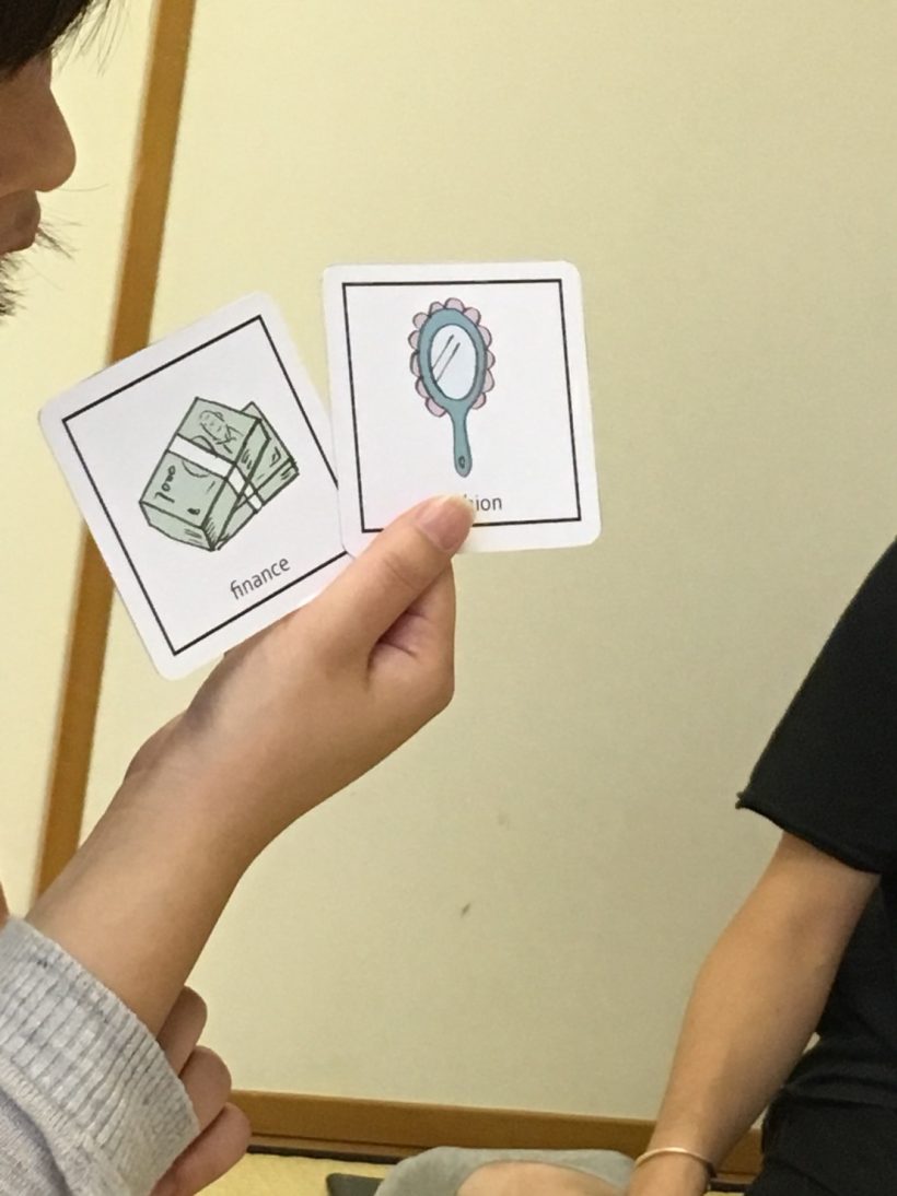 道具を持っていくのは大変だったので、今回は紙に印刷されたカードを並べて選んでもらうことに。
