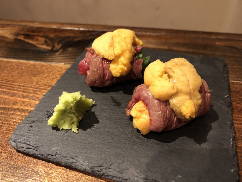 色々食べましたが、ここに行きたかった憧れのメニューが「極上生ウニと村上牛の贅沢巻」。