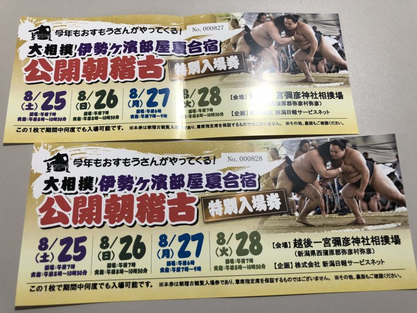 会社の出退勤の指紋認証システムのところに「大相撲伊勢ヶ濱部屋 新潟夏合宿」の無料チケット先着3名に配布します、と案内がありました。