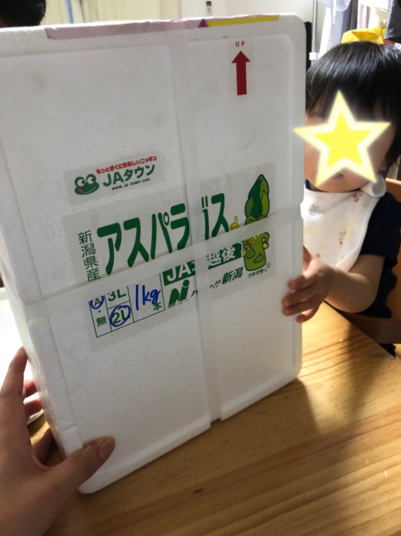 娘とアスパラガスが入った箱