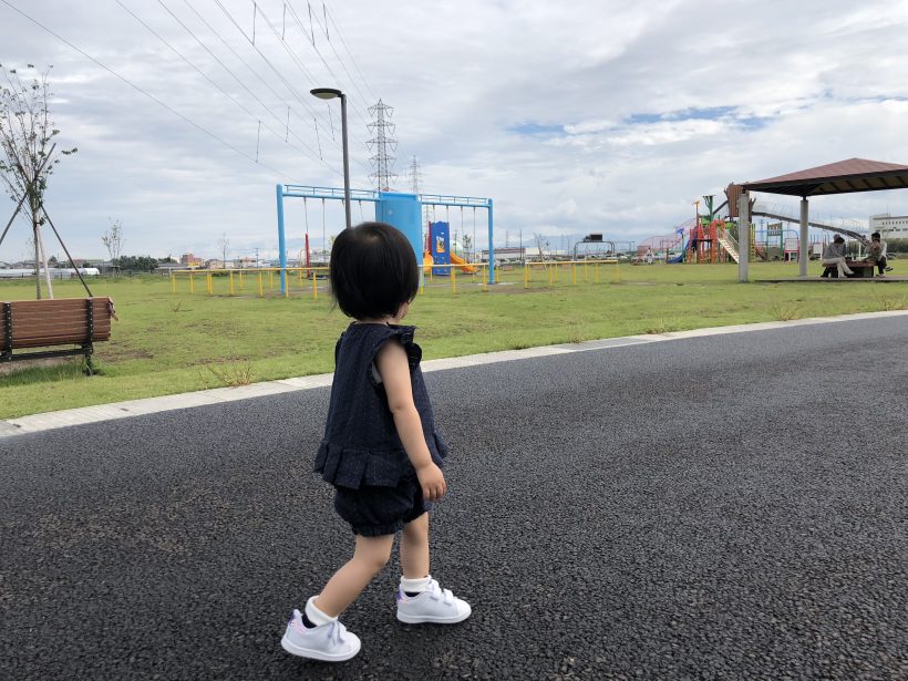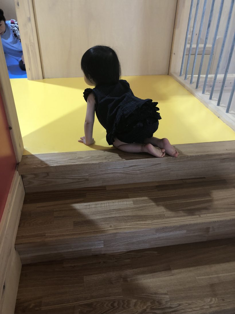 その後、幼児向けの遊び場に行って少しおままごと道具に興味を示しましたが、また階段に戻って遊んでました。まだ1歳ちょっとの娘にはおままごとは早かったようです。