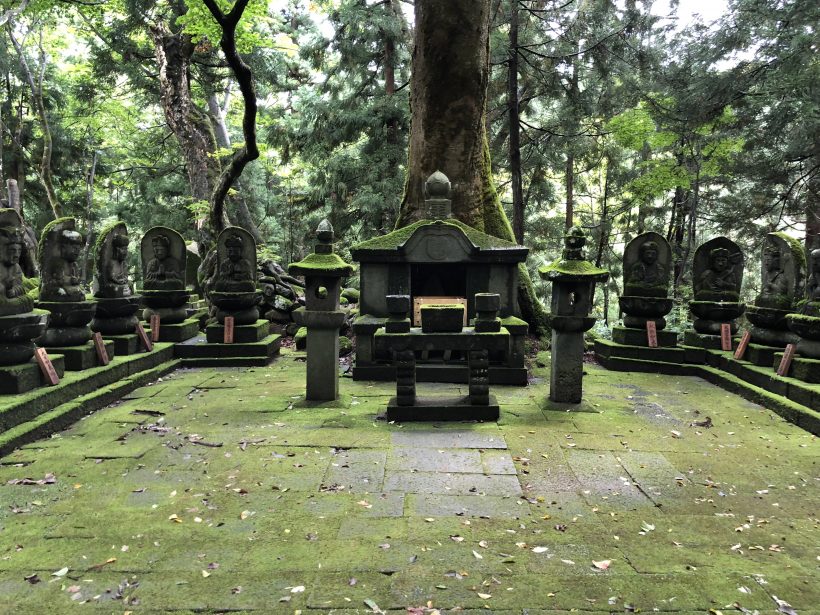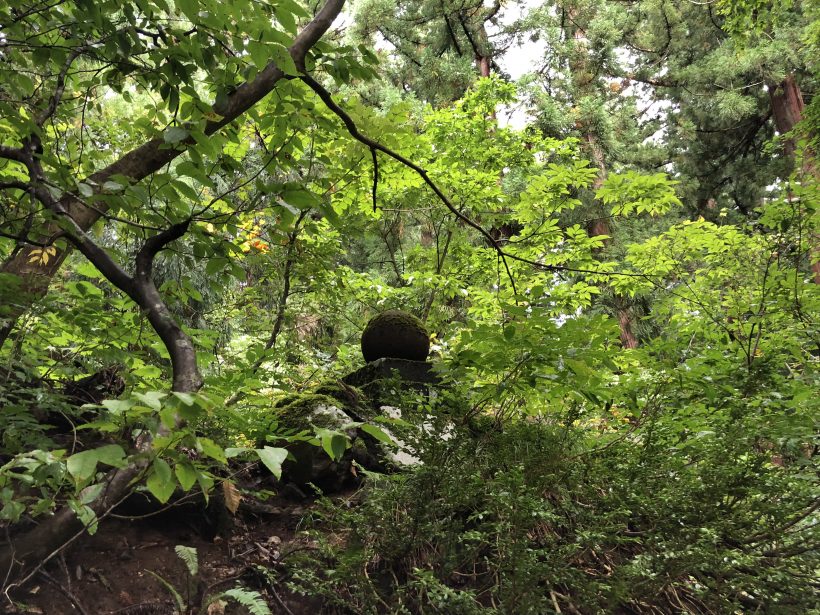 周囲を大きな木々で囲まれた中にある、石で作られた仏様が祀られている「鉢の石仏」。