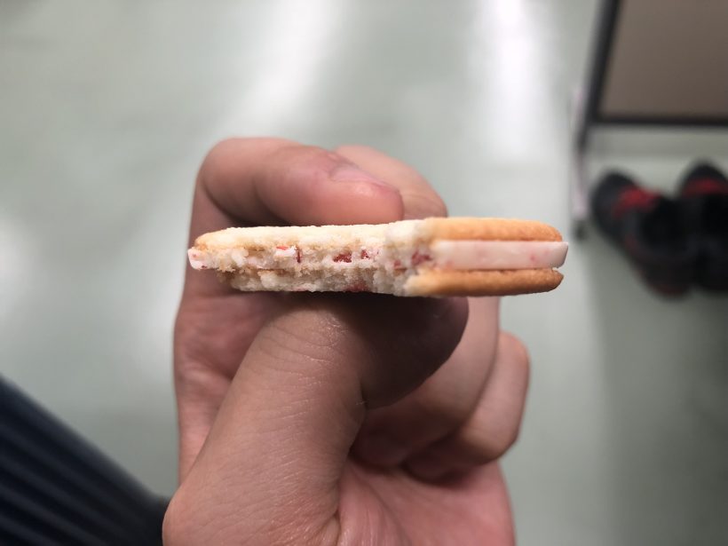 クッキーにイチゴ味のチョコレートを挟んだお菓子。