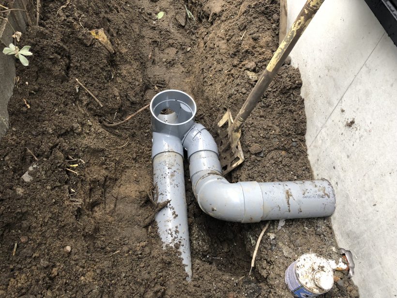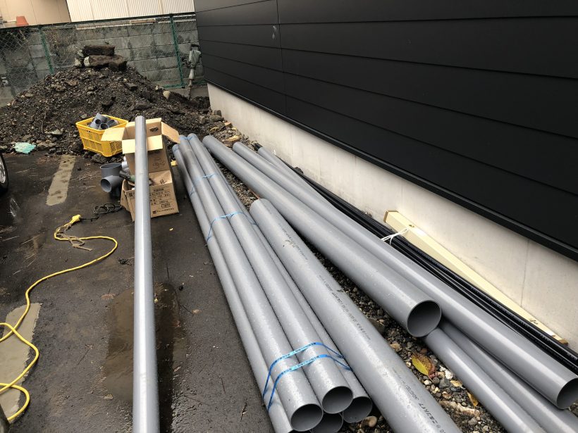 お仕事内容は、新築の水道と下水の配管工事でした。配管って、こんな塩ビ管を繋いで埋めていきます。水道のための配管と、トイレやシンクなどの排水のための配管、2種類あります。
