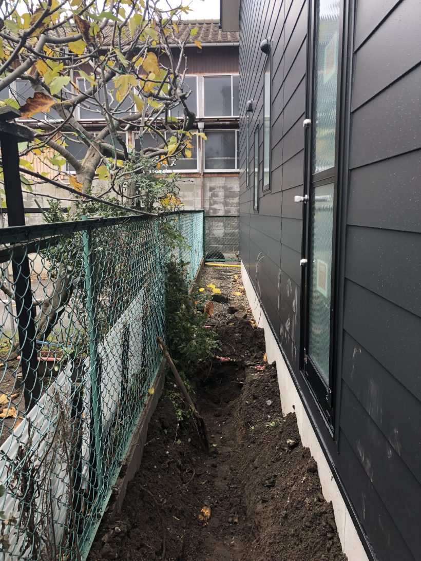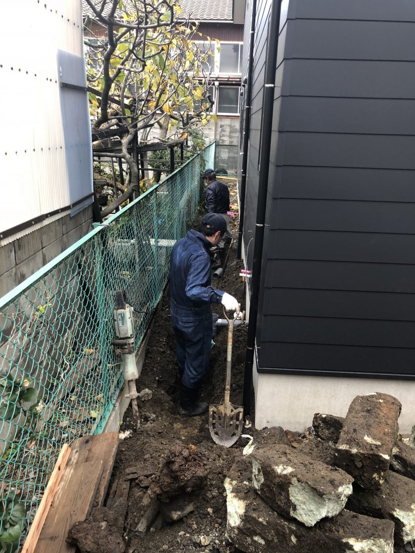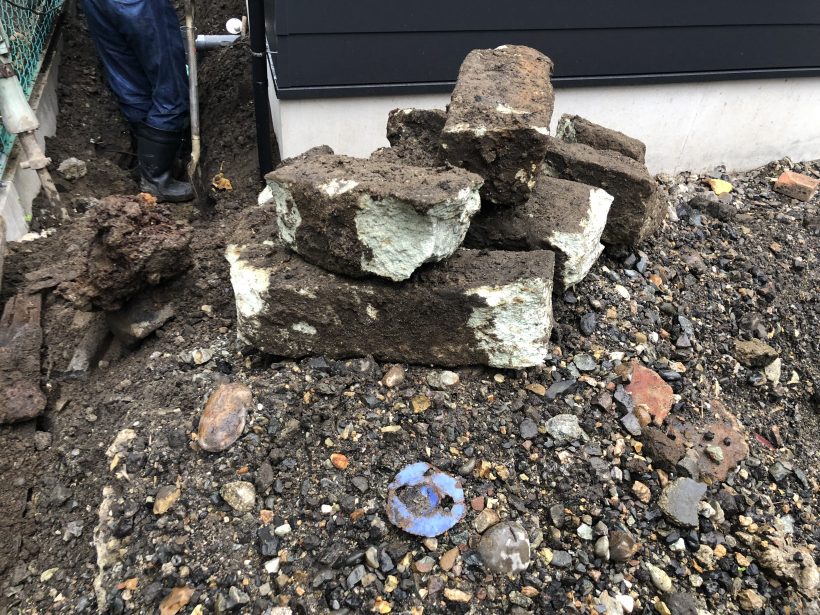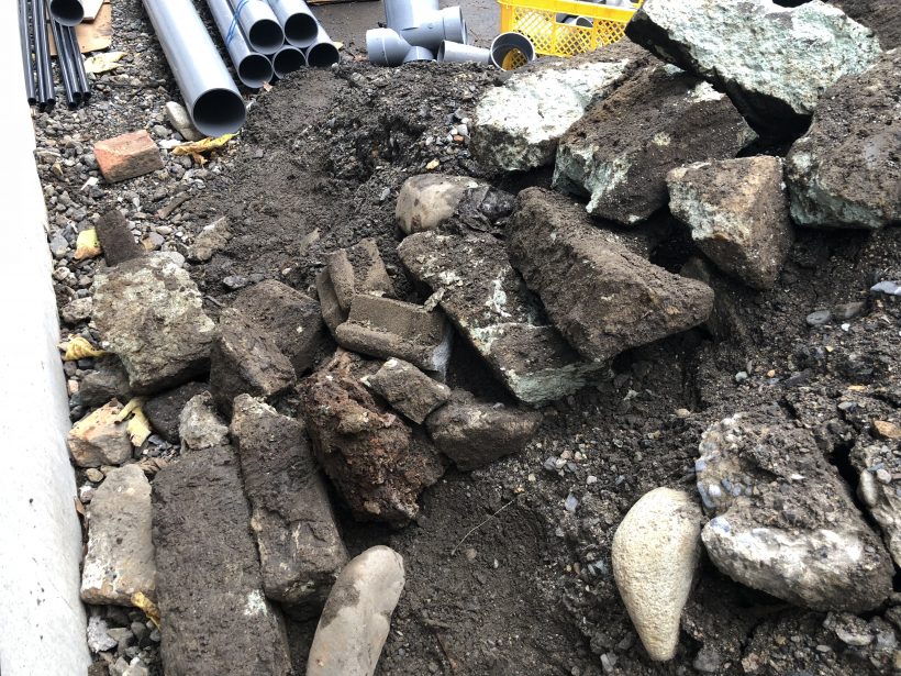基本的に私は配管するために穴を掘る作業をしていましたが、全然スコップが入っていかないのです。理由は土質。もはや「土」ではなく「石」でした。ゴロゴロと大きい石が出てくる。石というよりは瓦礫みたいな物ばかりでしたが。