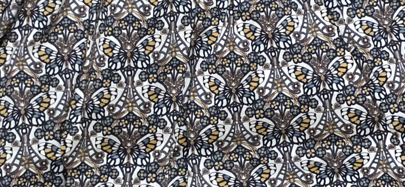 リバティ柄のチュニックは100㎝の物を購入したのでまだまだ大きいのですが、今だと袖を折り返して着ればワンピース風に着ることができます。身幅も余裕があるので動きやすい。柄はよく見ると、蝶々なんですよ。