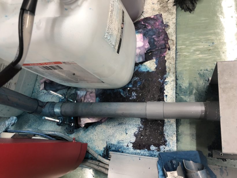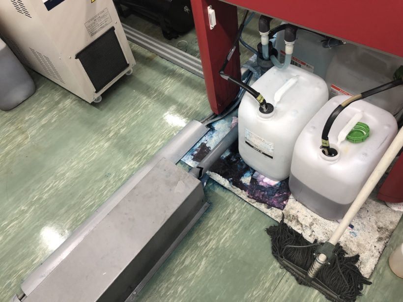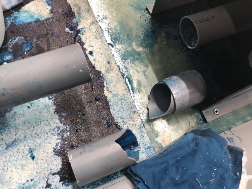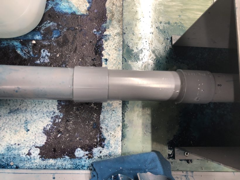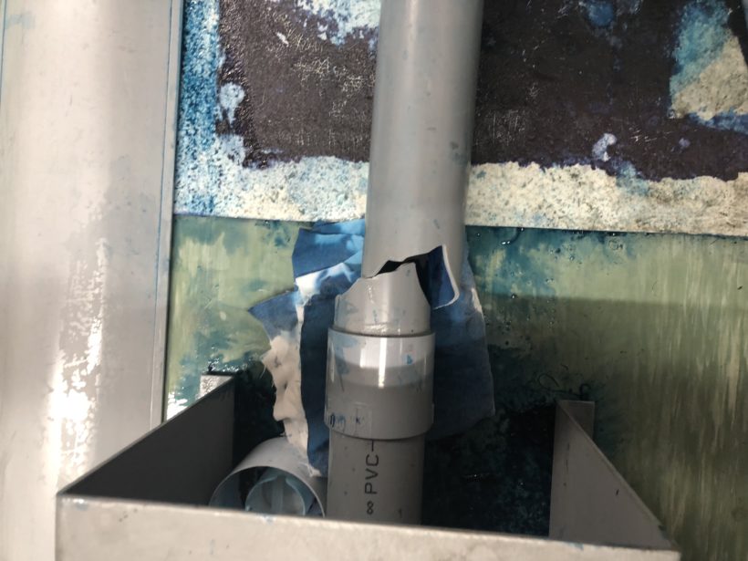 製版の機械の中に水(ガム液)を溜めていてこの水で刷版を洗うのですが、その水を交換するときに配水するために必要な排水管です。誤って足をかけてしまい割れてしまったそうです。