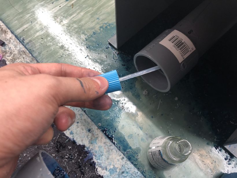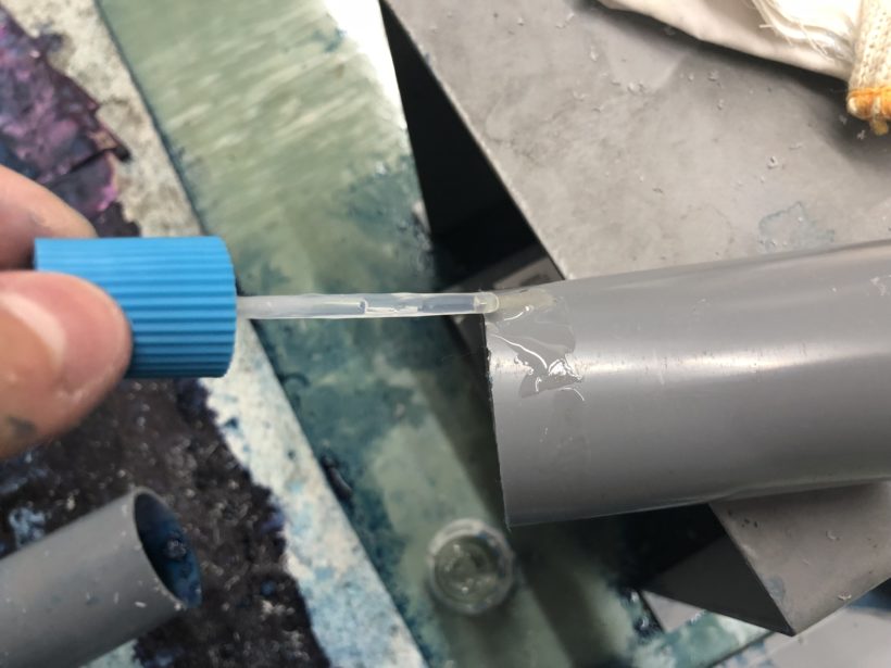 そして、継ぎ手を片方だけつけます。接着剤を継ぎ手の中の方と、差しこむパイプ側に塗って奥まで差し込みます。