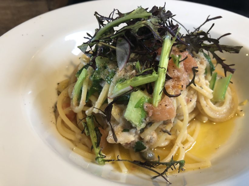 奥さんのパスタは「新潟県真鯖のレモン煮オイルソース」。