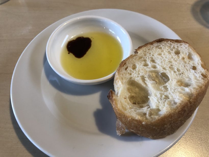 パンはハード系でオリーブオイルとバルサミコ酢がついてます。