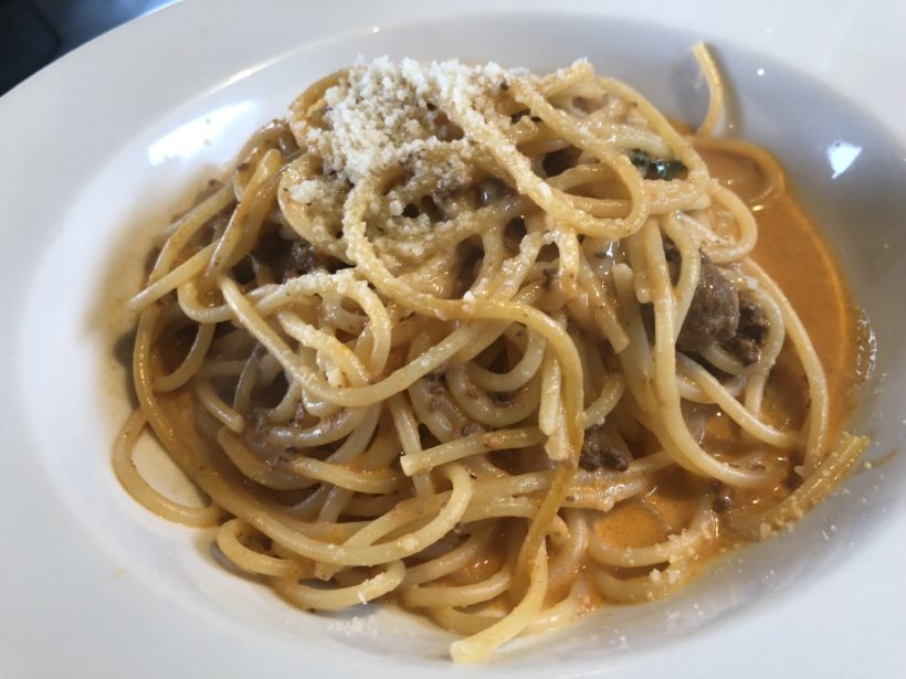 ミートソースはどのお店でもあるけど、クリーム系はあまり見ないです。トマトの酸味が抑えられて濃厚な感じになっていておいしかったです。因みに大盛り(+230円)にしました。このミートソースはジョルニランチの1,400円に+100円で注文できます。