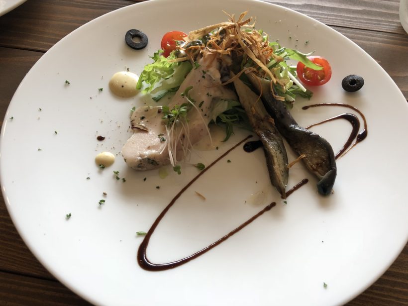 ハーブチキン、茄子のマリネ、サラダのプレートと、サツマイモのポタージュ。