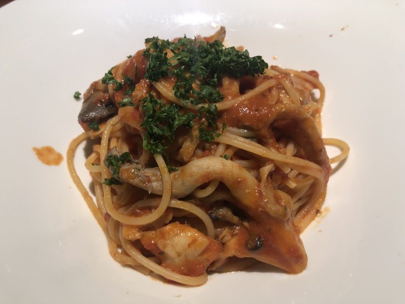パスタはノドグロがたくさん入っていて美味しかった。ヒラタケも歯ごたえがあっていい食感。