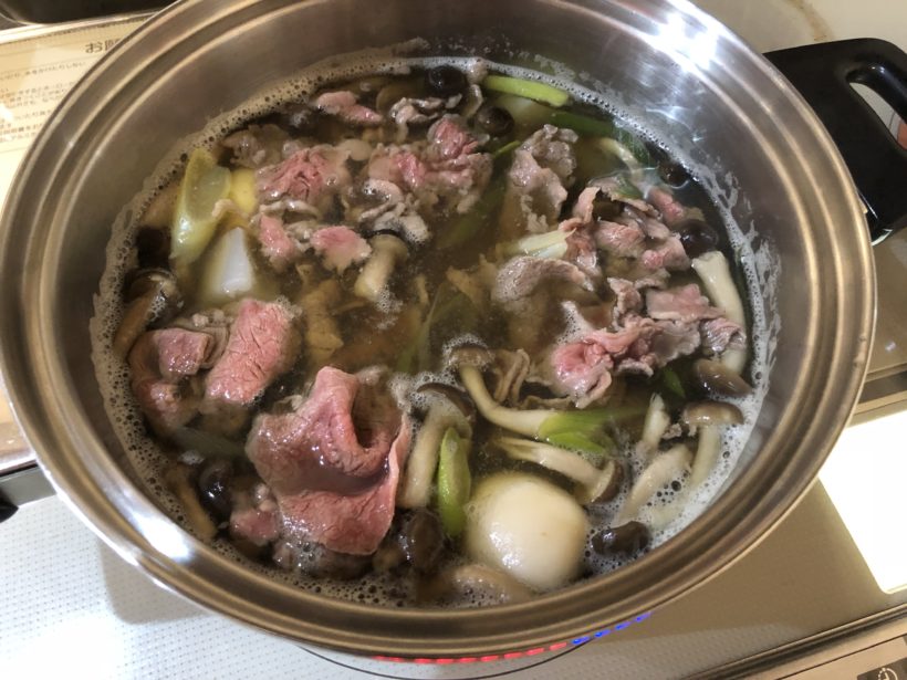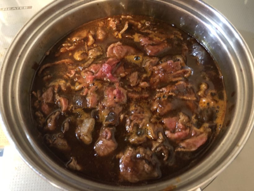 米沢牛は増量ということで、規定量の200gを芋煮に使い、残りの300gはお義父さんが赤ワイン煮にしてくれました。