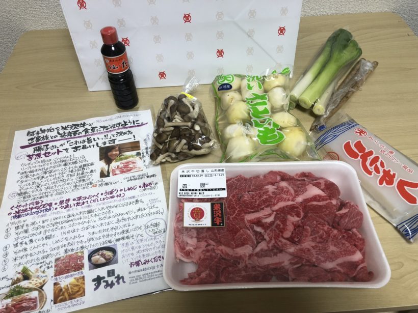 米沢牛の芋煮セット。しかも、社長のご好意で、通常の肉の量より増量された特別版。
