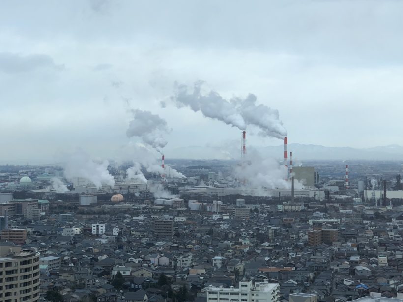 北越紀州製紙の工場。寒いせいか煙突からの煙がいつもよりモクモク。