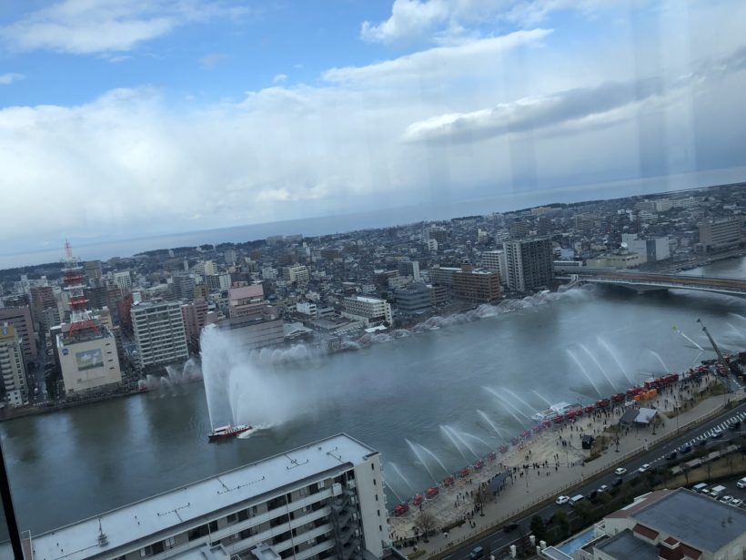 この日は、たまたま消防出初式が行われていて、タイミングよく信濃川両岸から消防車による川への放水を見ることができました。