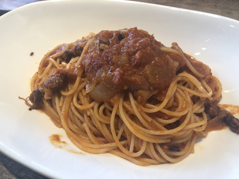 パスタは大盛りにしましたが、かなりの量でした。ニンニクが効いていて、ホタルイカのうまみが感じられて美味しいし大満足。