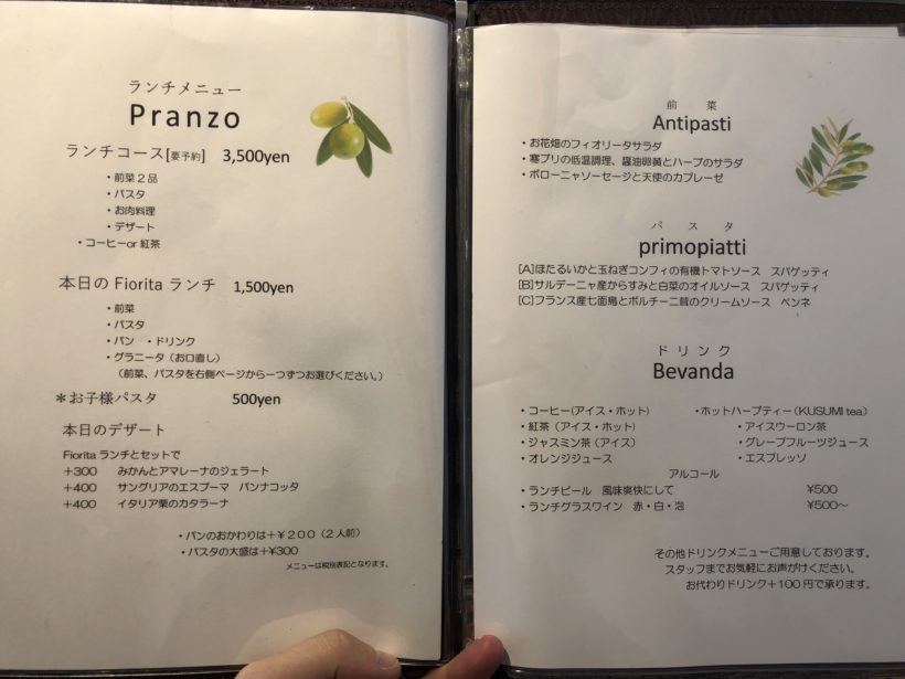 本日のフィオリータランチ(1,500円)にしました。前菜、パスタとも右の欄から一つ選びます。