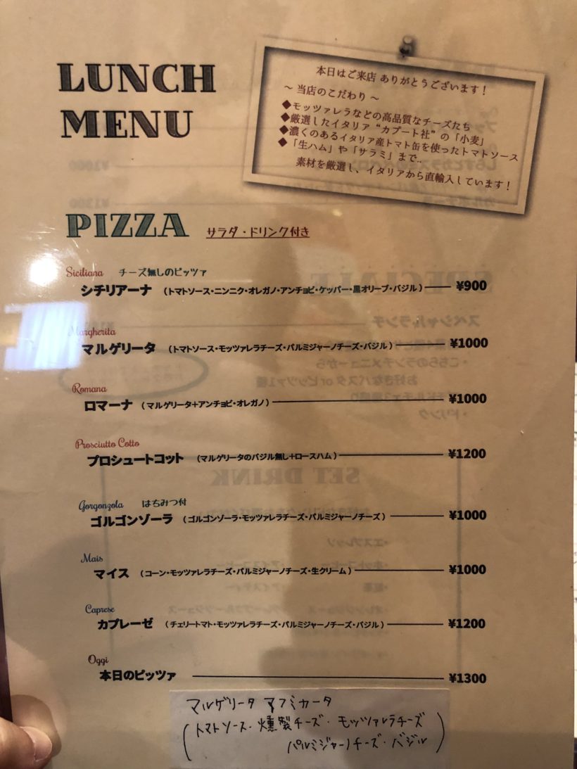 前菜とサラダ、ピザorパスタを選択、デザート、ドリンクで税込1,800円。