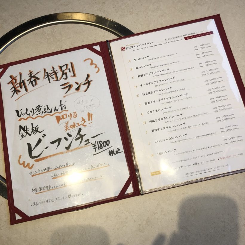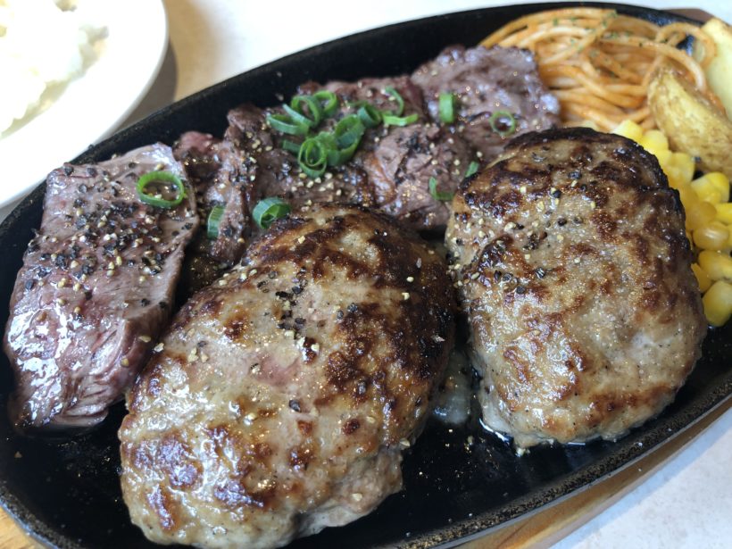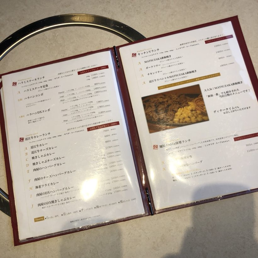 近江牛がウリのお店。私はハラミステーキ(80g)とハンバーグ(200g)の「ハラハンコンボ Large」税抜1480円、奥さんは大人気でテレビでも紹介された松阪牛を使用した「MATSUZAKA鉄板焼き」税抜1280円、娘には「お子様ランチ」税抜680円を注文しました。