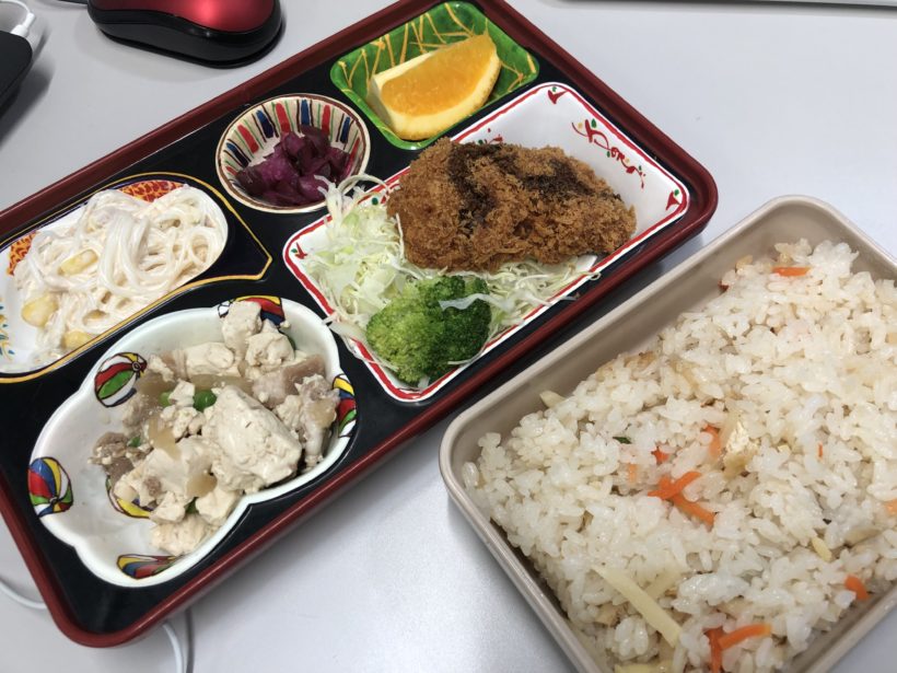 お昼前には会社にお弁当が届けられます。ウチだけなのかわからないですが、お弁当のご飯は別の箱になっていて、保温機でご飯を温かい状態に保ってくれます。