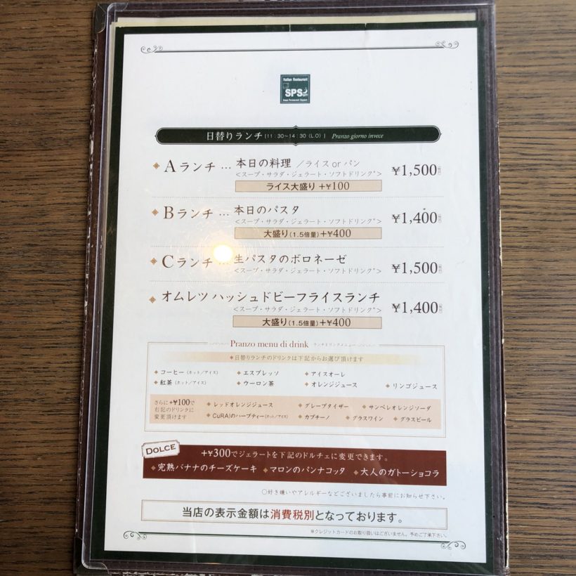 サラダ+スープ+パスタ+デザート+ドリンクで1500円(税別)。大盛りは+400円(税別)です。生パスタから乾麺に変更しても値段は変わりません。