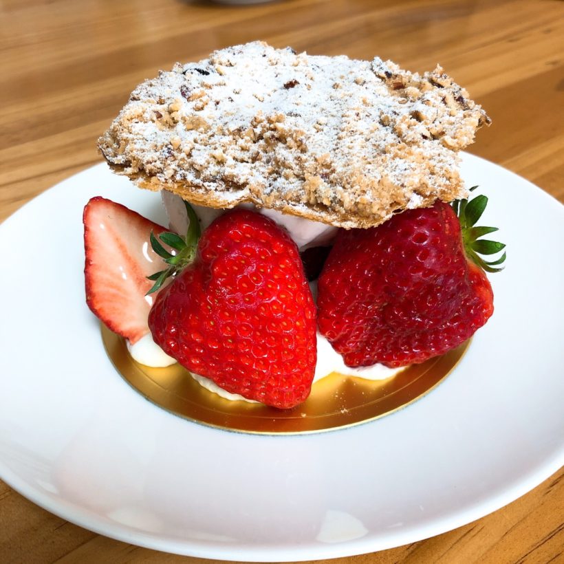 見た目だけでなく、食べてもおいしい。パイは胡桃が使われていて香りがいい。挟まれているクリームはチーズ系でいちごも練られています。もちろん大きいいちごが2つ使われている他にカットされたいちごもたくさん挟まれています。これだけでかくて内容もないようなので価格も734円(税込)と他のケーキに比べればお高めですが、まったく問題ないですね。むしろ安い。安すぎる。東京なら確実に1500円以上とられますね。