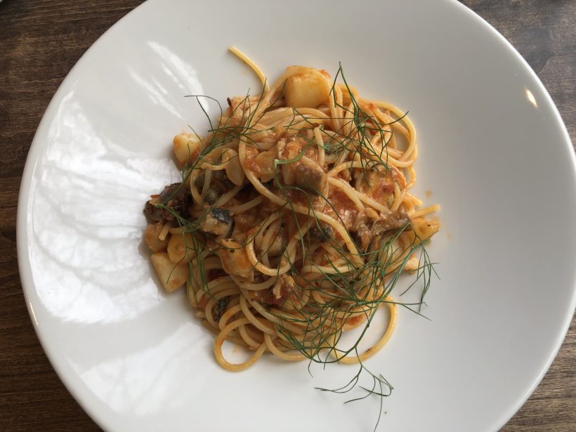 じゃがいも、ホタテ、白身魚、エビなどが煮込まれたトマトソースでした。パスタは太めの麺が使われていてモチモチした食感。美味しかったです。