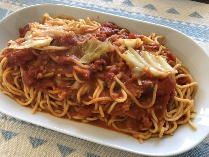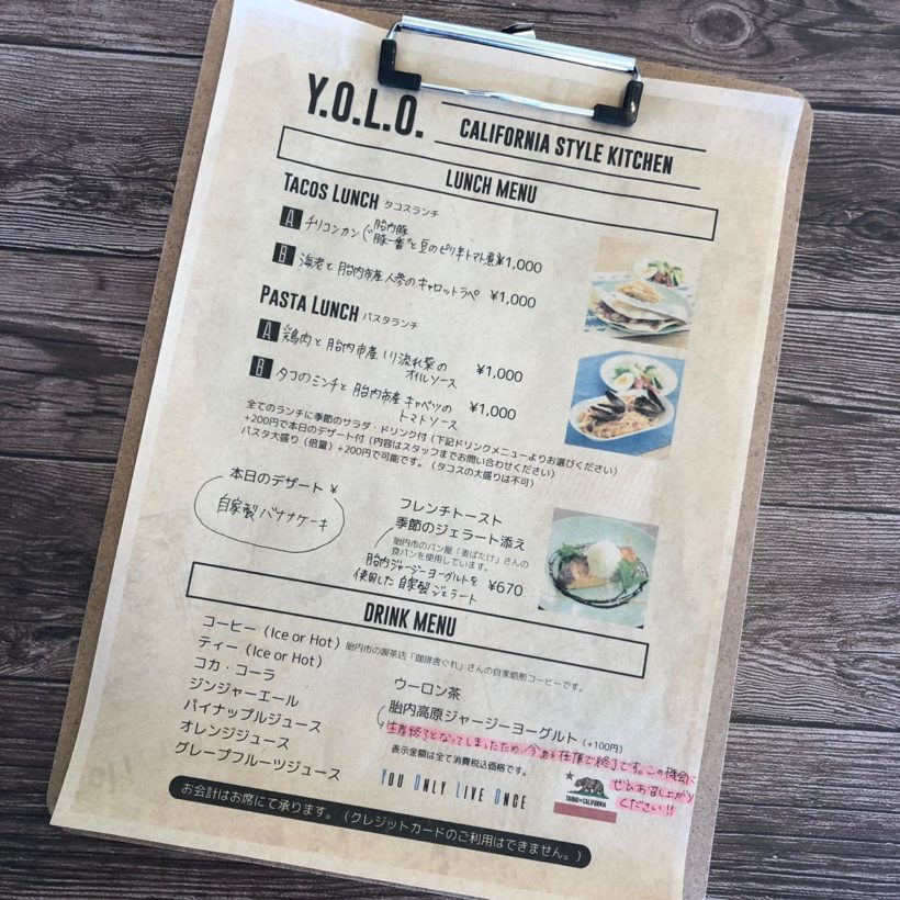 私は、パスタの「タコのミンチと胎内市産キャベツのトマトソース(大盛)」、奥さんはタコスの「チリコンカン(胎内豚”一番豚”と豆のピリ辛トマト煮)」と「本日のデザート 自家製バナナケーキ」にしました。