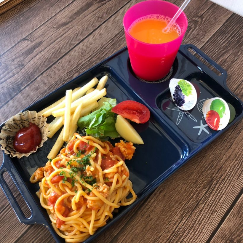 キッズプレートは子供なら誰もが好きなミートソースパスタ。ポテトとゼリーもついてきます。これで500円は安い。