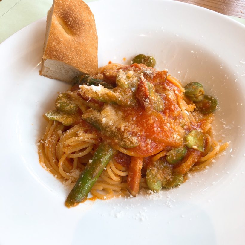 奥さんは「パスタセットA タカギベーコンと玉葱、アスパラガス、空豆のトマトソース」。