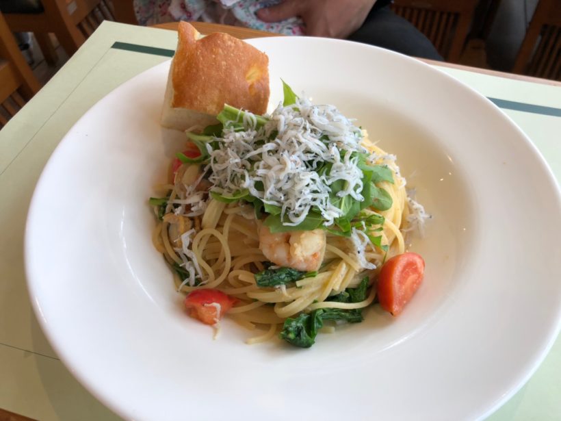 私は「パスタセットB むきエビとホタテ稚貝、しらす、フレッシュトマト、ルッコラのオイルソース(大盛り)」にしました。