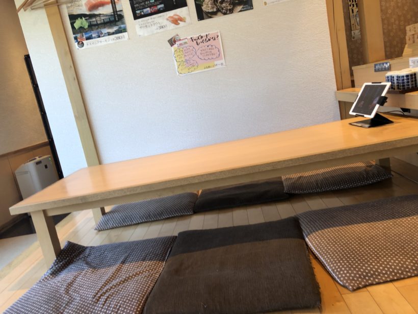 私のような赤ちゃん連れ、2歳の子連れには座敷は欠かせません。空間もゆったりしているし窮屈という事はありません。この日は次女を座布団の上に転がしてました。気持ちよさそうに寝てくれていたのでお寿司を心置きなく楽しむことができました。