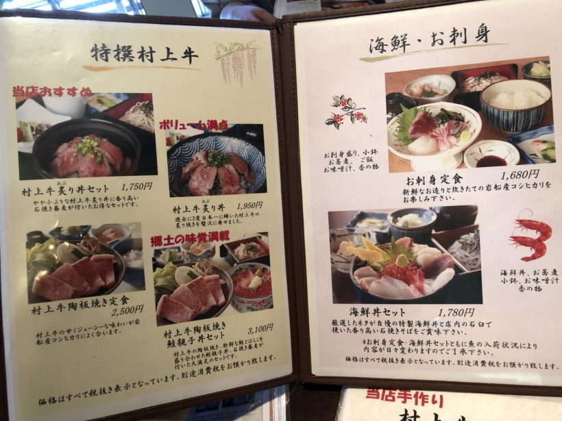 お蕎麦、海鮮、村上牛と、村上市名産の美味しいものをこの1店舗で楽しめます。