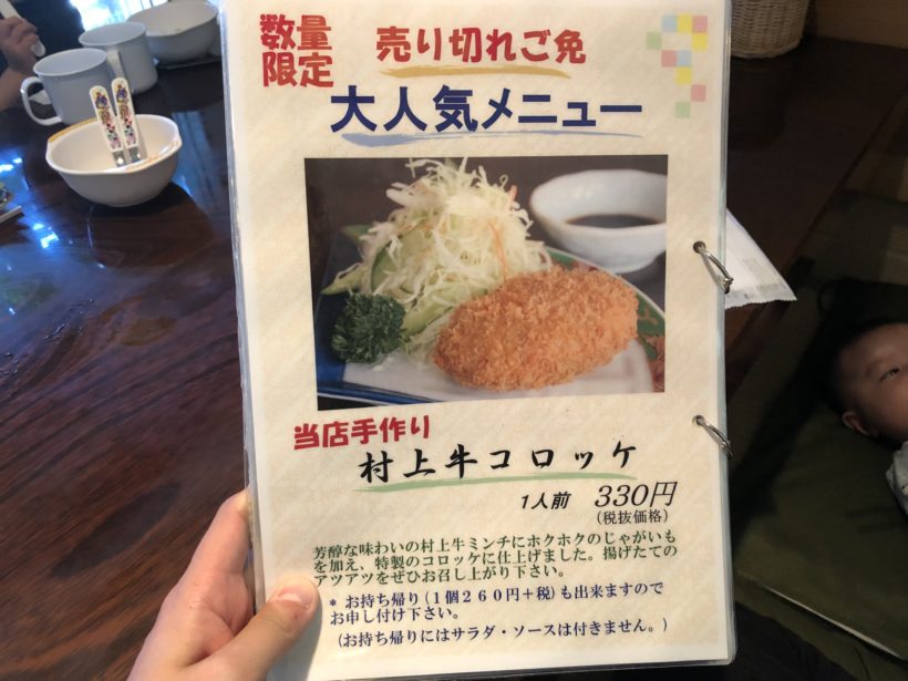 私は「鮭親子丼(大盛り)」、奥さんは「村上牛炙り丼セット(うどん)」、長女に「村上牛コロッケ」を注文。