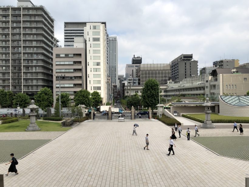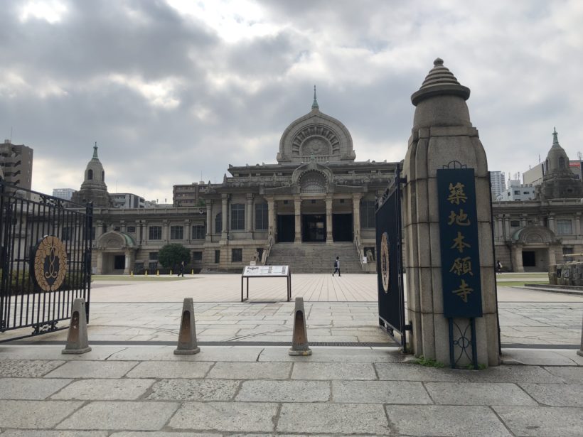 東京メトロ日比谷線築地駅を降りて、築地場外市場に向かう道の途中でなにやら拝んでいる方々が多数見られました。何かと思ったら、突如巨大寺院が現れました。