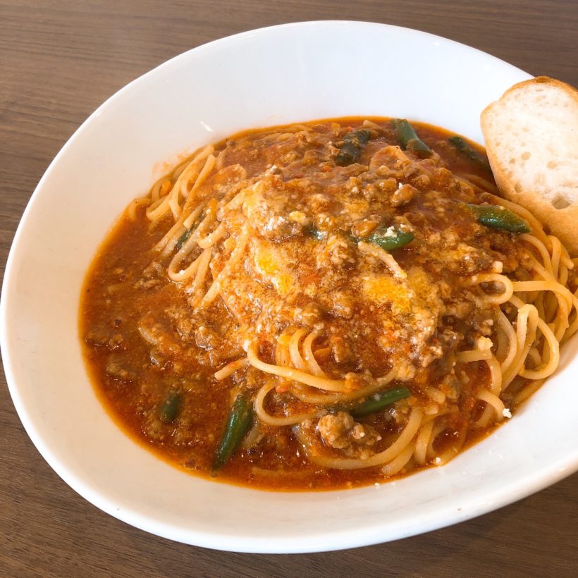 「自家製ミートソース生パスタ」もソースがたっぷりで美味しかった。1,000円で大盛りは+150円。