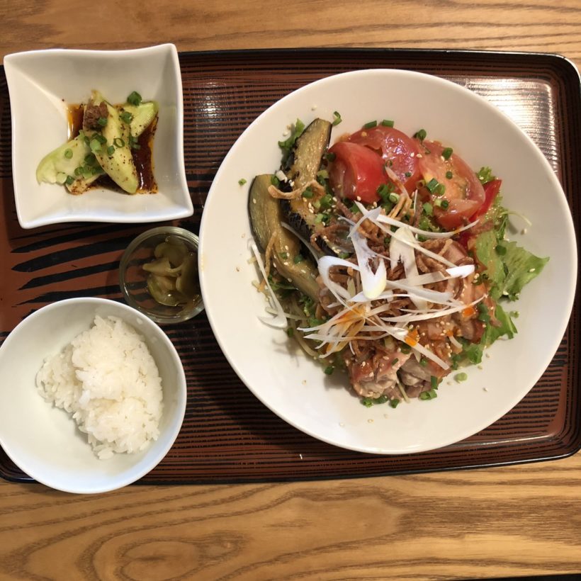 鶏ゴマ冷麺はナスやトマトなどの野菜とがっつり鶏肉が、夏の暑い中でも食べやすく、ボリュームも満点な冷麺。冷たい麺類はからこれからの季節は嬉しいですよね。