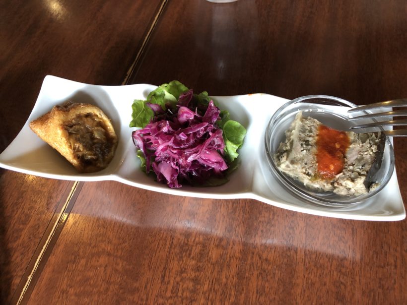 ランチにはすべて前菜3種が付きます。カレーパン、紫キャベツのマリネ、羊と米ナスのムサカ。ムサカはパテのような食べ物。パテ好きなので美味しかったです。