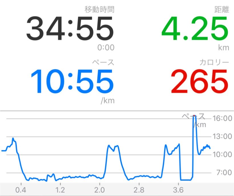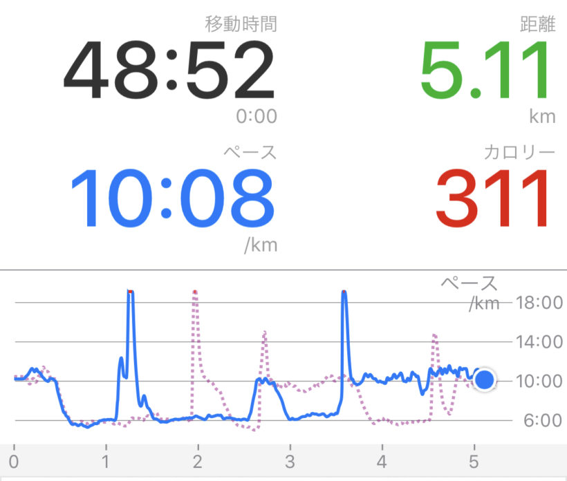 歩いたり走ったり止まったりなのでペースのグラフが大きく振れています。